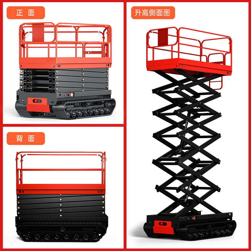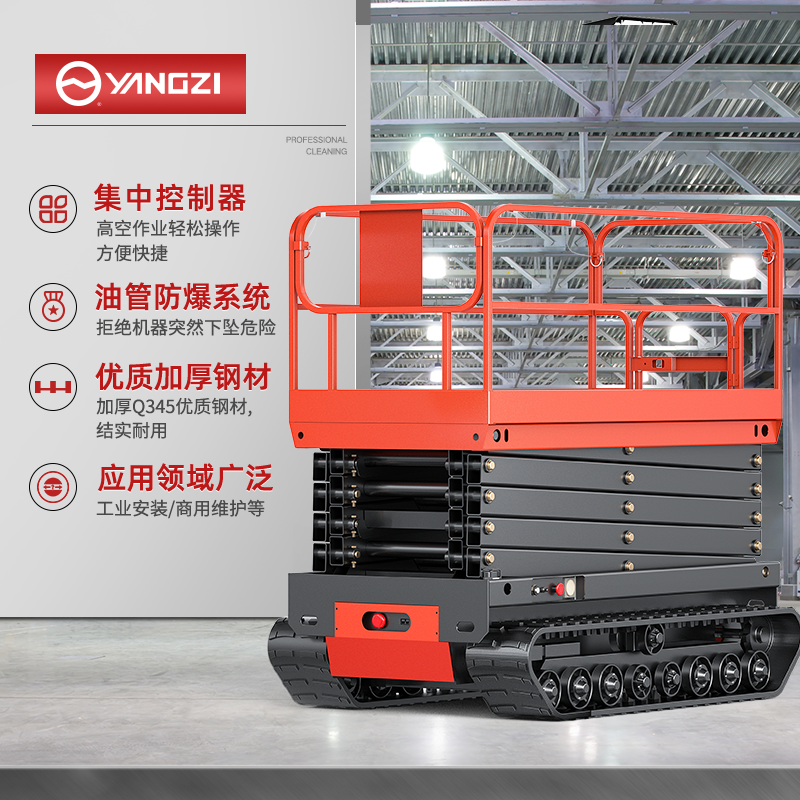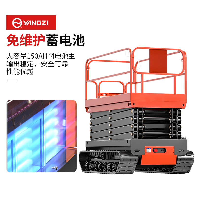 揚子履帶式升降平臺SJY032:跋山涉水,如履平地,安全承載,加固護欄,剪叉支架Q345優(yōu)質(zhì)鋼材,坦克式底座自由靈活,操作簡單,加厚鋼材,免維護電池。