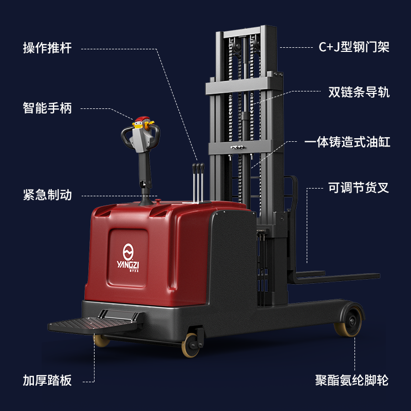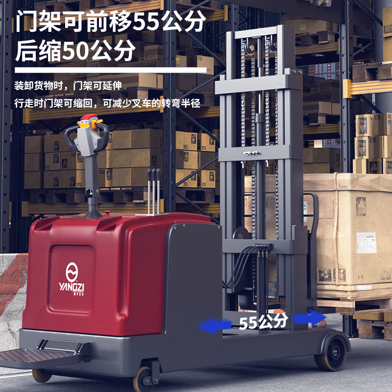 揚(yáng)子推高車 CQD-J:不用條托盤的前移式電動(dòng)堆高車,增強(qiáng)載重,通過性強(qiáng),貨叉前段可緊貼地面方便叉取貨叉,而且門架后仰時(shí)貨物穩(wěn)定不易滑落,使用更安全放心。